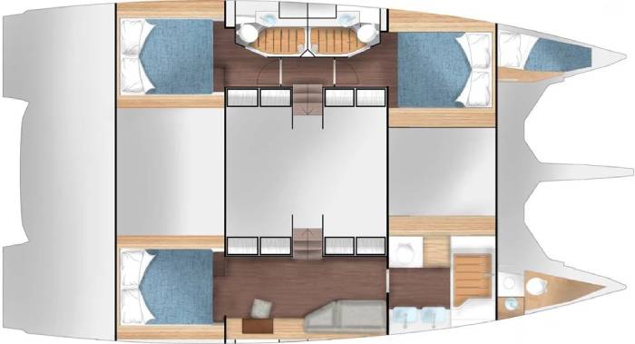 The flybridge is equipped with a single helm that has the latest navigational equipment, a self-tacking jib, and winches within easy reach, making this cat easy and simple to handle.